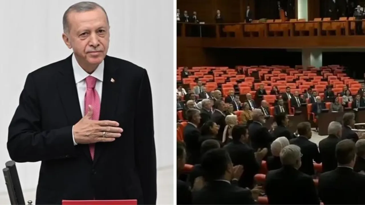 Cumhurbaşkanı Erdoğan'ı ve 'li milletvekilleri ayakta alkışlarken, muhalefet sıraları ise ayağa kalkmadı. DEVA, Gelecek, Saadet Partililer ise ayakta selamladı.