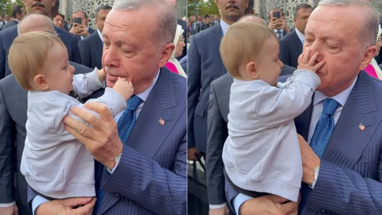Almanya'nın Köln kentinden gelen bir çiftin oğullarını kucağına alan Cumhurbaşkanı Erdoğan, minik Mahir'i bir süre sevdi.