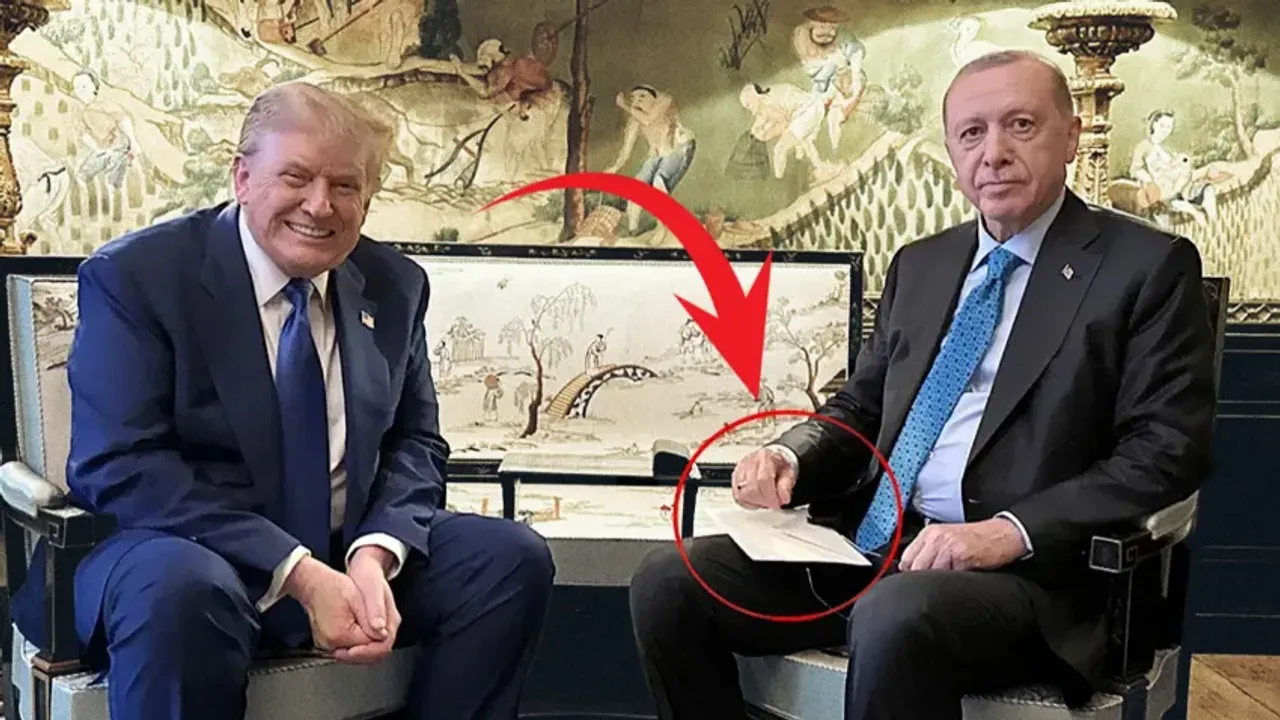 Kraliyet Sarayı'nda basına kapalı yapılan görüşmeyle ilgili servis edilen fotoğrafta bir ayrıntı ise dikkat çekti. İlgili fotoğrafta, Trump'la yan yana oturan Erdoğan'ın elinde bir zarf olduğu görüldü. Zarfta ne olduğu merak konusu oldu.