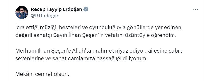 Cumhurbaşkanı Erdoğan, sosyal medya hesabından yayımladığı taziye mesajında, "İcra ettiği müziği, besteleri ve oyunculuğuyla gönüllerde yer edinen değerli sanatçı Sayın İlhan Şeşen’in vefatını üzüntüyle öğrendim. Merhum İlhan Şeşen'e Allah'tan rahmet niyaz ediyor; ailesine sabır, sevenlerine ve sanat camiamıza başsağlığı diliyorum. Mekanı cennet olsun" dedi.