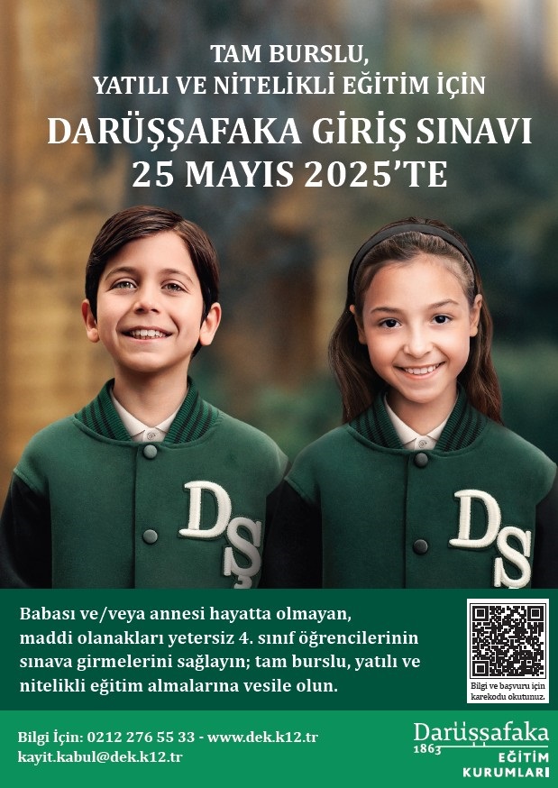 Darüşşafaka Eğitim Kurumlarının 2025 yılı giriş sınavı, 25 Mayıs Pazar günü, saat 11.00'de, Türkiye'nin 42 ilinde düzenlenecek. Türkiye Cumhuriyeti vatandaşı ilkokul 4’ncü sınıf öğrencilerinin katılabildiği Darüşşafaka Giriş Sınavı’nda başarılı olan, mali durum araştırması ve sağlık kurulu kontrolünden geçen öğrenciler, tam burslu, yatılı ve İngilizce ağırlıklı eğitim alma imkanı kazanacak.