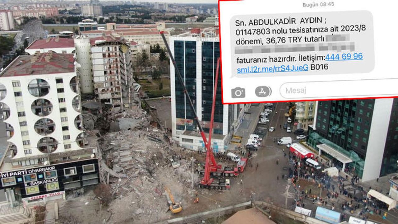 Kahramanmaraş merkezli depremlerde, 1 blokunun yıkılması sonucu 89 kişinin yaşamını yitirdiği, 3 bloku da ağır hasar gördüğü için kontrollü olarak yıkılan Galeria Sitesi’ndeki daire sahipleri, 3 gün önce SMS yoluyla elektrik faturası gönderildi. Tepkiye neden olan faturalarla ilgili enerji şirketi yetkilileri, elektrik bedellerinin Bakanlıkça ödeneceğini belirtti.