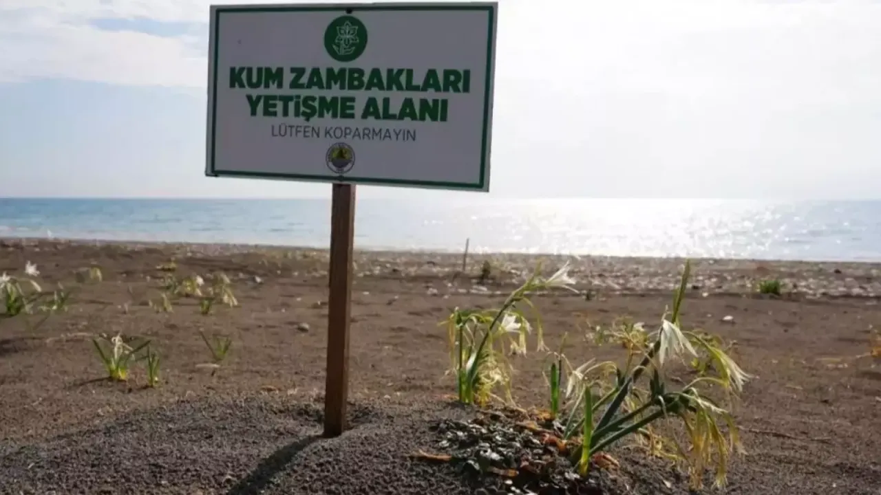 Etkinlikte sahile, "Kum zambakları yetişme alanı. Lütfen koparmayınız" yazılı tabela yerleştirildi.