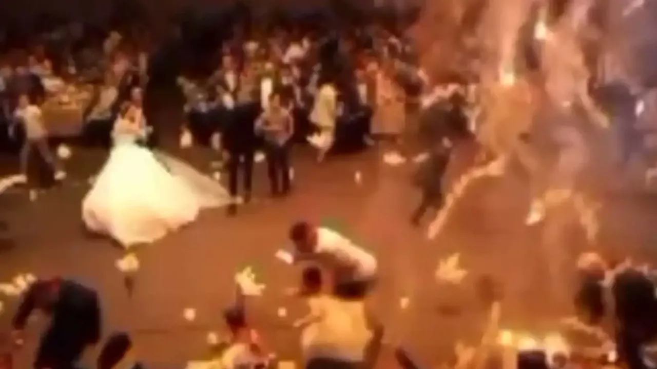 Gelin ve damadın dans ettiği esnada çıkan yangın görüntüleri sosyal medyaya da yansıdı