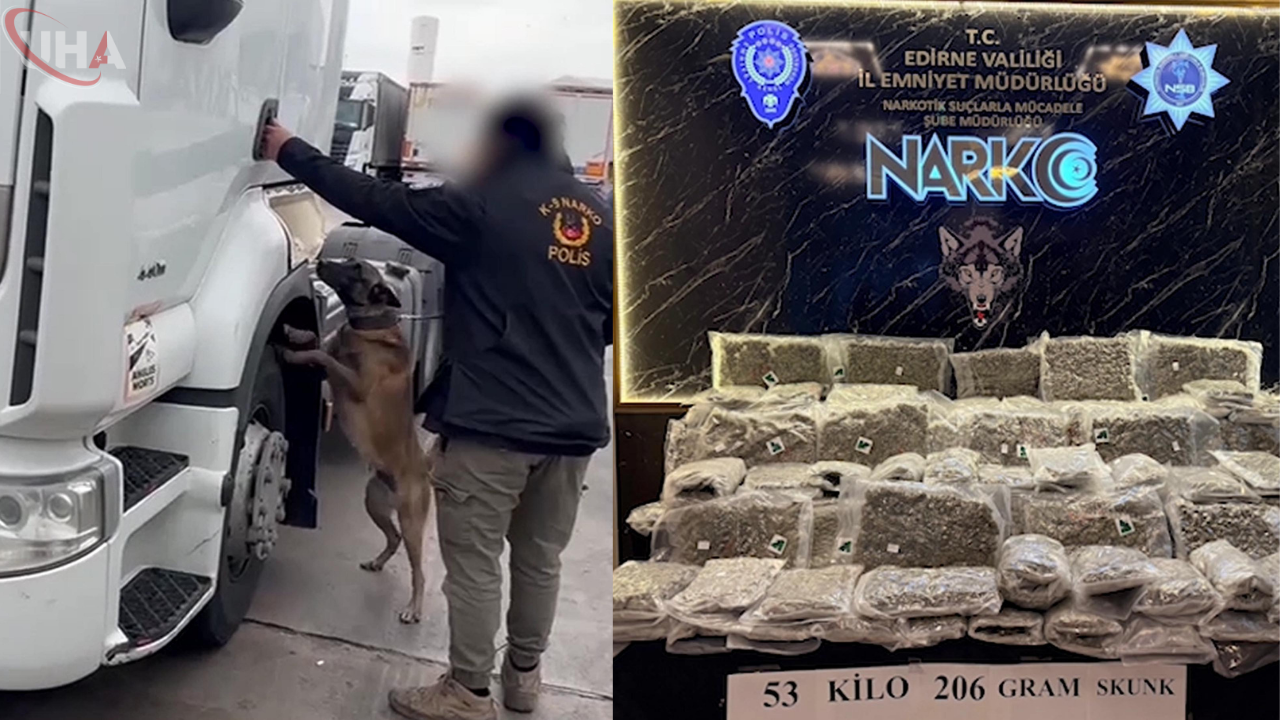 Edirne Emniyet Müdürlüğü Narkotik Suçlarla Mücadele Şube Müdürlüğü ekipleri tarafından yurt dışından gelecek bir TIR'da uyuşturucu bulunduğu belirlendi. Takibe alınan TIR, Bulgaristan'a açılan Kapıkule Sınır Kapısı'ndan yurda giriş yaptıktan sonra ekiplerce durduruldu. Ekiplerin narkotik köpekleri ile araçta yaptığı aramada, çeşitli yerlere gizlenmiş 53 kilo 206 gram skunk ele geçirildi. Gözaltına alınan 2 şüpheli hakkında adli işlem başlatıldı.