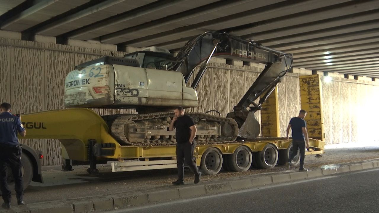 Elazığ'da, TIR, taşıdığı iş makinesi ile alt geçitte sıkıştı. 1,5 saatlik çalışmanın ardından TIR ve iş makinesinin lastikleri indirilerek sıkıştıkları alt geçitten kurtarıldı.