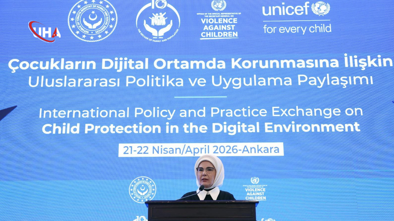 Cumhurbaşkanı Erdoğan'ın eşi Emine Erdoğan, Aile ve Sosyal Hizmetler Bakanı Mahinur Özdemir Göktaş ile beraber, Aile ve Sosyal Hizmetler Bakanlığı, Birleşmiş Milletler (BM) Genel Sekreteri Çocuklara Yönelik Şiddet Özel Temsilciliği Ofisi ve UNICEF iş birliğinde, Ankara'da düzenlenen 'Çocukların Dijital Ortamlarda Korunması: Uluslararası Politika ve Uygulama Paylaşımı' toplantısına katıldı. Emine Erdoğan, tehlikelerin çocukları sadece sokakta ya da dış dünyada değil, dijital dünyada da kuşattığını belirterek, dünya genelinde internet kullanıcılarının 3'te 1'ini oluşturan çocukların, karşı karşıya olduğu risklerin alarm verici boyuta ulaştığını vurguladı. Meselenin ülkelerin sınırlarını aşan, ortak çözümler üretmeyi ve birlikte hareket etmeyi zorunlu kılan küresel bir sorumluluk olduğuna dikkati çeken Erdoğan, Aile ve Sosyal Hizmetler Bakanlığı, UNICEF'e ve Birleşmiş Milletler Genel Sekreteri Çocuklara Yönelik Şiddet Özel Temsilciliği'ne iş birlikleri için teşekkür etti. Emine Erdoğan, günümüzde bilgi teknolojileri sayesinde çocukların yapay zeka destekli öğrenme araçları, çevrim içi eğitim platformları ve küresel bilgi ağları gibi önceki nesillerin sahip olmadığı ölçüde öğrenme ve gelişim fırsatına sahip olduklarını söyledi.