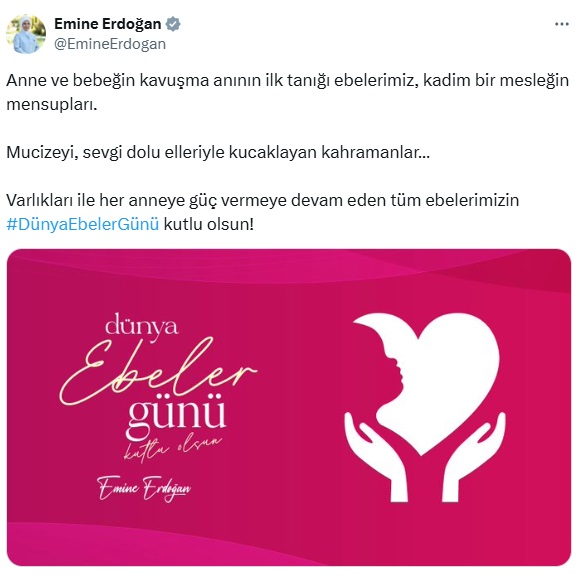 Emine Erdoğan, sosyal medya hesabından, Dünya Ebeler Günü'ne ilişkin paylaştığı mesajında, "Anne ve bebeğin kavuşma anının ilk tanığı ebelerimiz, kadim bir mesleğin mensupları. Mucizeyi, sevgi dolu elleriyle kucaklayan kahramanlar. Varlıkları ile her anneye güç vermeye devam eden tüm ebelerimizin Dünya Ebeler Günü Kutlu olsun" ifadelerini kullandı.