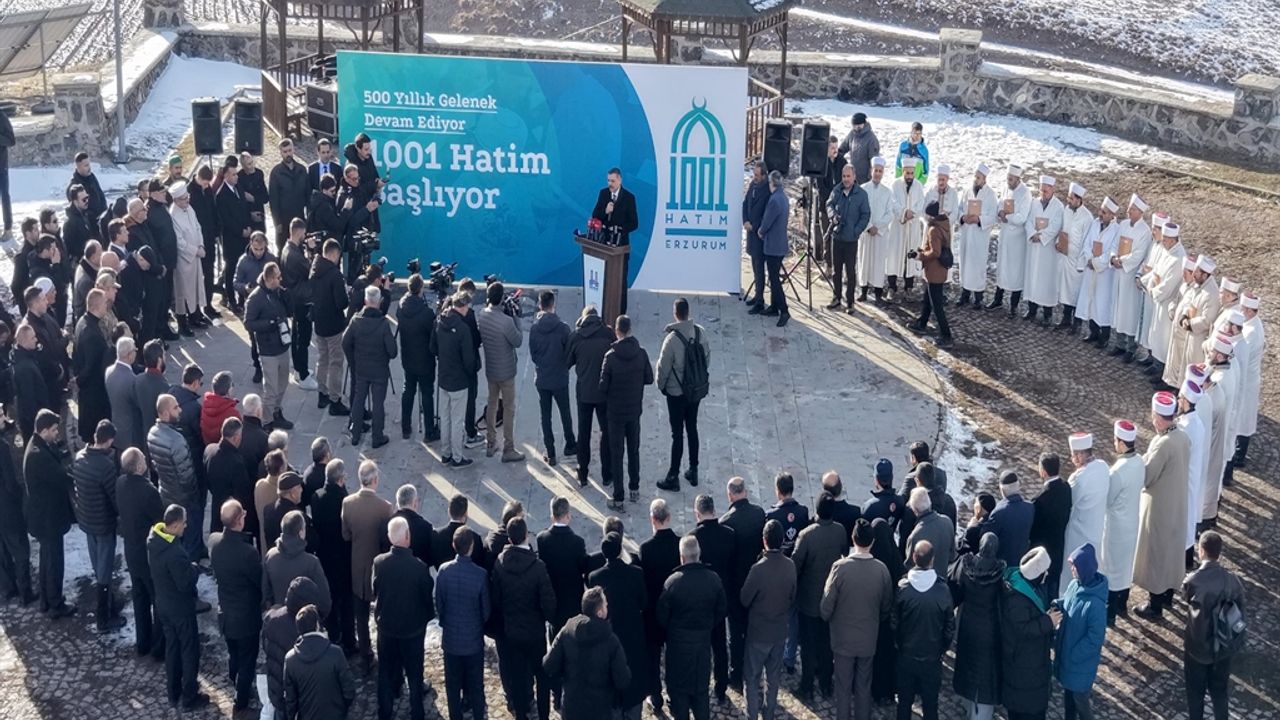 Erzurum'un köklü dini ve kültürel değerlerine dikkat çeken Erzurum Valisi Mustafa Çiftçi, "Bugün mübarek cuma günündeyiz. Hayırlı bir günde, hayırlı bir vesileyle; 1001 Hatim Programı'nın başlaması münasebetiyle sizlerle bir aradayız. Bu sene '1001 Hatim' Programı, inşallah bugünkü açılış programıyla başlıyor. 19 Aralık tarihinde başlayacak olan program, 16 Ocak tarihinde yapılacak dua ile sona erecek. Pir Ali Baba'nın yaklaşık 500 yıl önce başlattığı bu kutlu gelenek sayesinde, yılın son 2 haftasını hatimlerle ihya etmiş olacağız. Aynı şekilde 2026 yılının da ilk 15-16 gününü yine hatimlerle karşılamış olacağız" dedi.