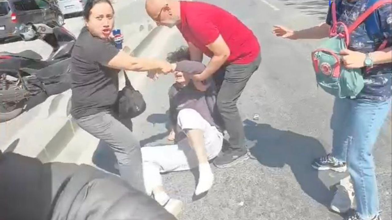 Yol verme nedeniyle çıkan kavgada karşıya geçmeye çalışan genç, sürücünün saldırısına uğradı. Yayaya tekme atan otomobil sürücüsü çevredekiler tarafından güçlükle sakinleştirildi. O anlar saniye saniye motokuryenin kask kamerasına yansıdı.