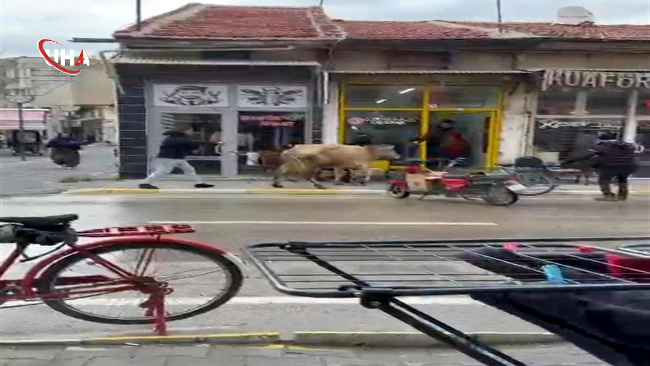 Bolvadin'de dün öğle saatlerinde sahibinin elinden kaçan inek çarşı merkezinde bir süre başıboş dolaştıktan sonra berber dükkânı ile çay ocağının kapısından içeri girmeye çalıştı. Çay ocağı işletmecisi Hakan Aktepe'nin, kapıdan uzanıp ipini tuttuğu inek güçlükle yakalandı. İnek daha sonra sahibi tarafından götürüldü.