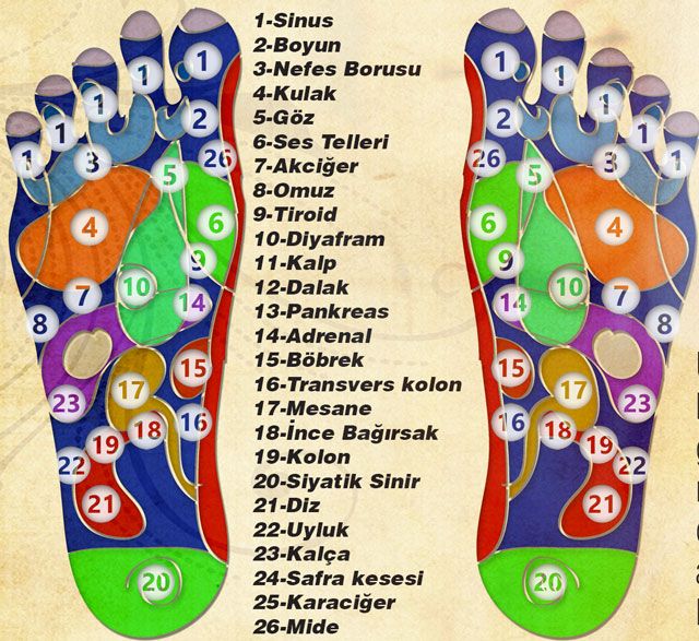 Ayaklar ılık suyla yıkandıktan sonra parmak uçlarından topuğa kadar dairesel hareketlerle masaj yapılabilir. Doğal bitkisel yağlar (lavanta, nane gibi) kullanılarak etkisi artırılabilir. Her iki ayağa 10–15 dakikalık uygulama yeterlidir.