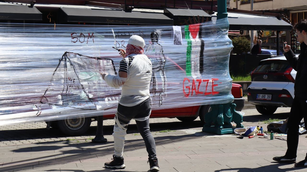 İsrail’in Gazze yönelik saldırılarına tepkiler sürüyor. Artvin Çoruh Üniversitesi Güzel Sanatlar ve Tasarım Fakültesi Görsel İletişim Tasarımı Bölüm Başkanı Doç. Dr. Kemal Sağlam da Gazze’de yaşananlara dikkat çekmek adına, ilçedeki merkez cami avlusunda 2 aydınlatma direği arasına streç film gerip tuval oluşturdu. Tuvale Gazze’de yaşananları resmeden Sağlam, resimlerinde sivillerin ve çadırların bombalandığı mesajlarını verdi. Tuvaline Filistin bayrağı ve Mescid-i Aksa'yı da çizen Doç. Dr. Sağlam, sargı bezleriyle sarılı kostüm giyip yaralı bir Filistinliyi de canlandırdı. Doç. Dr. Sağlam'a fakülte öğrencileri de eşlik etti. Gazze’de yaşanan insanlık dramına dikkat çekmek istediğini dile getiren Doç. Dr. Sağlam, “Son günlerde İsrail, 2 yıldır yaptığı katliamları daha büyüterek oradaki insanların bezden yapmış oldukları çadırları bile bombalamakta. Oradaki insanlar evlerini kaybetmiş durumdalar. Çadırlarda yaşam mücadelesi verirken, çoluk çocuk, bebek demeden tüm dünyanın gözü önünde insanlar öldürülüyor. Biz de bu yaşanan acı olayları bir sanatçının diliyle ifade etmek ve Gazze’deki katliamları anlatmaya çalıştık” diye konuştu.
