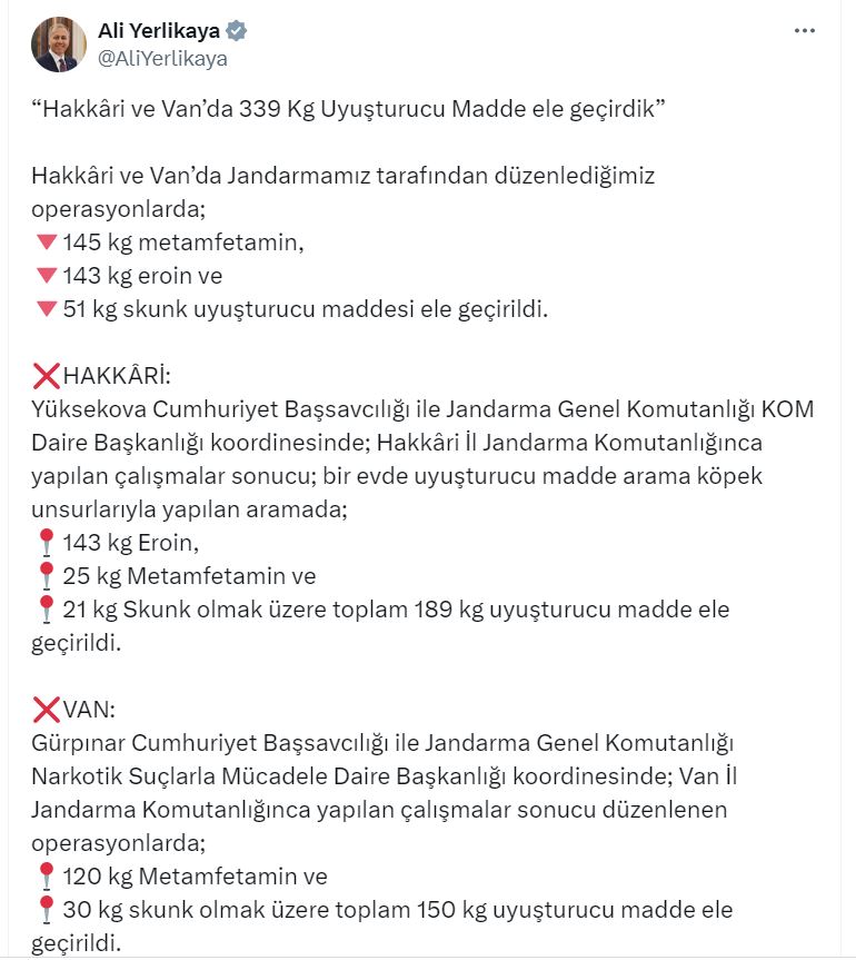 Bakan Yerlikaya, Hakkari ve Van'da toplamda 339 kilo uyuşturucu ele geçirildiğini belirterek, "Hakkari ve Van valimizi, operasyonları koordine eden Cumhuriyet başsavcılarımızı, il jandarma komutanlıklarımızı ve operasyonları gerçekleştiren kahraman jandarmamızı tebrik ediyorum. Uyuşturucuya karşı yürüttüğümüz bu mücadele, geleceğimizin teminatı olan gençlerimizi koruma mücadelesidir" dedi.