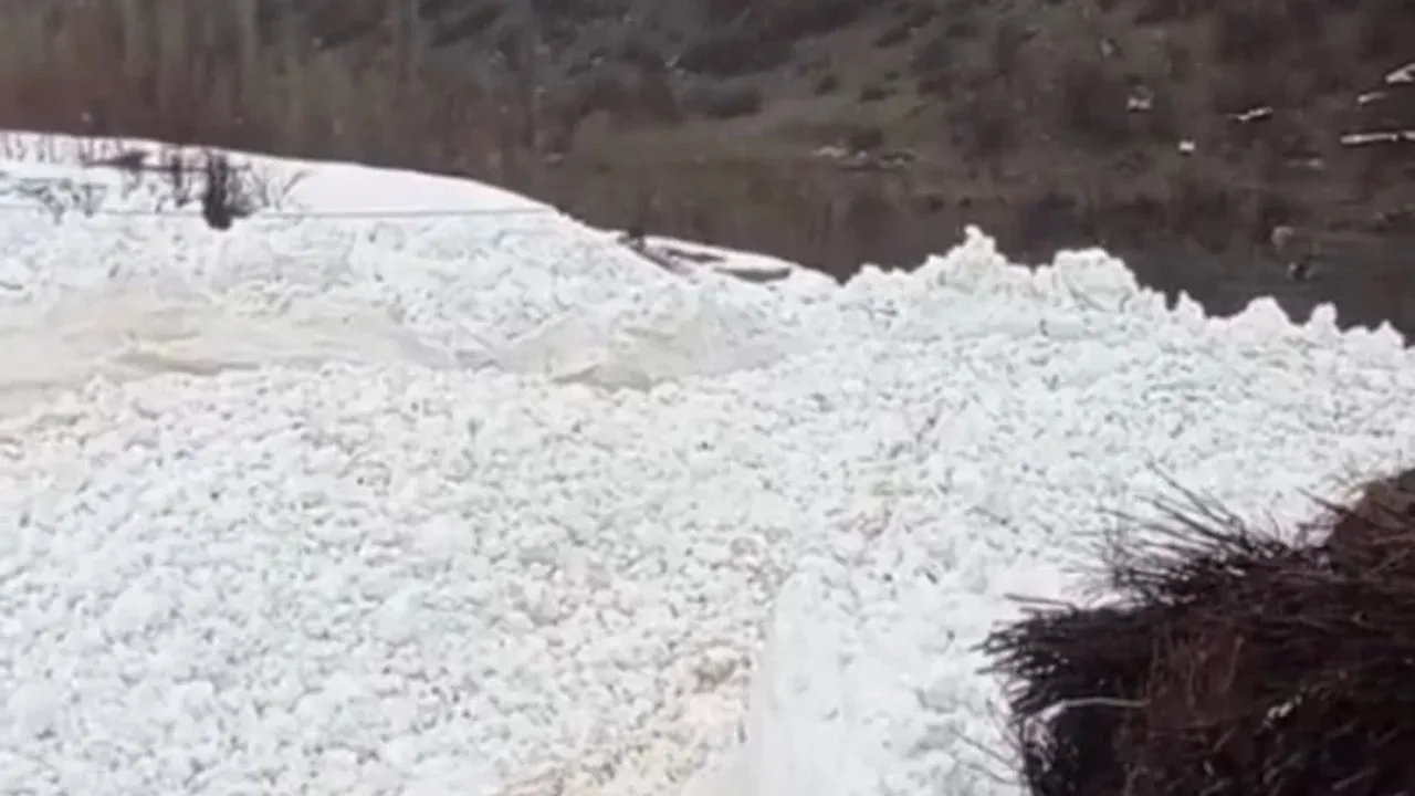Hakkari'de Yüksekova ilçesine bağlı Yeşiltaş köyünde dağdan kopan dev kar kütlesi, yerleşim alanının hemen sınırında durdu.