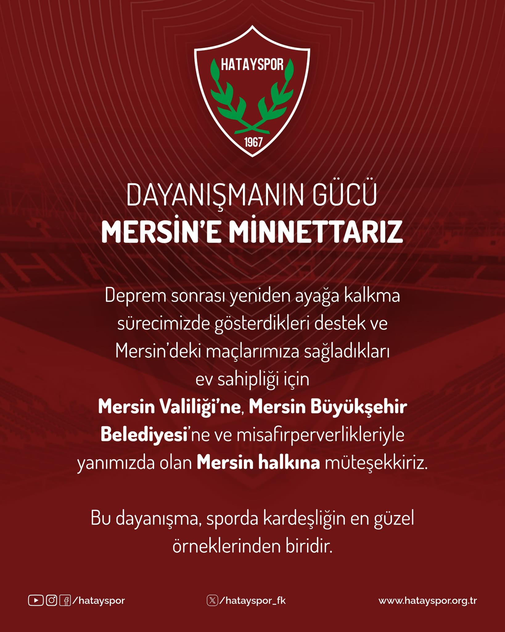 Gelecek sezon TFF 1'inci Lig'de mücadele edecek Hatayspor Kulübü’nden yayınlanan mesajda, “Deprem sonrası yeniden ayağa kalkma sürecimizde gösterdikleri destek ve Mersin’deki maçlarımıza sağladıkları ev sahipliği için Mersin Valiliği’ne, Mersin Büyükşehir Belediyesi’ne ve misafirperverlikleriyle yanımızda olan Mersin halkına müteşekkiriz. Bu dayanışma, sporda kardeşliğin en güzel örneklerinden biridir” denildi.