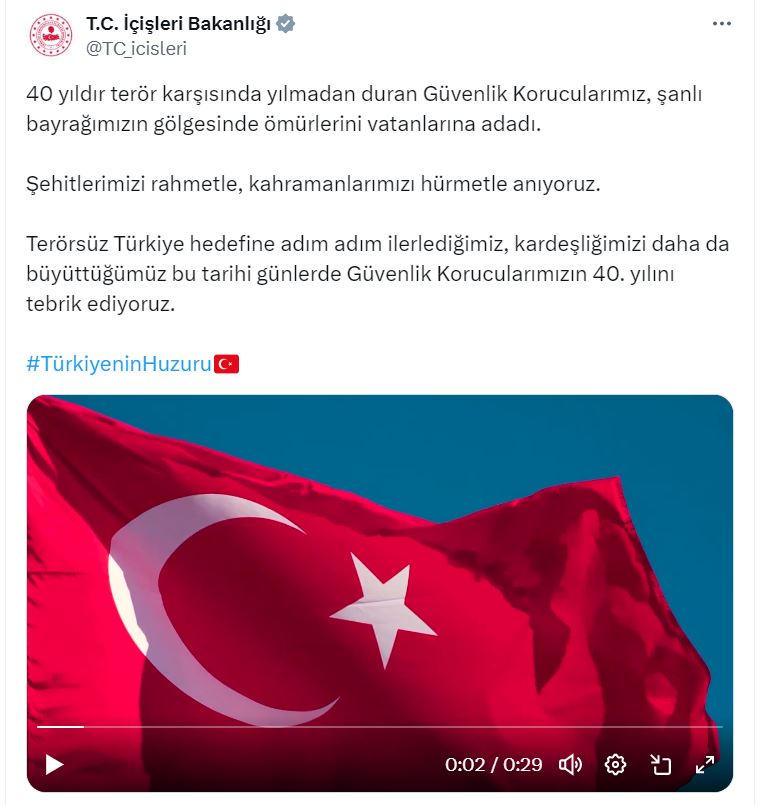 Bakanlığın sosyal medya hesabından yayımlanan mesajda, "40 yıldır terör karşısında yılmadan duran güvenlik korucularımız, şanlı bayrağımızın gölgesinde ömürlerini vatanlarına adadı. Şehitlerimizi rahmetle, kahramanlarımızı hürmetle anıyoruz. Terörsüz Türkiye hedefine adım adım ilerlediğimiz, kardeşliğimizi daha da büyüttüğümüz bu tarihi günlerde güvenlik korucularımızın 40'ıncı yılını tebrik ediyoruz" denildi.