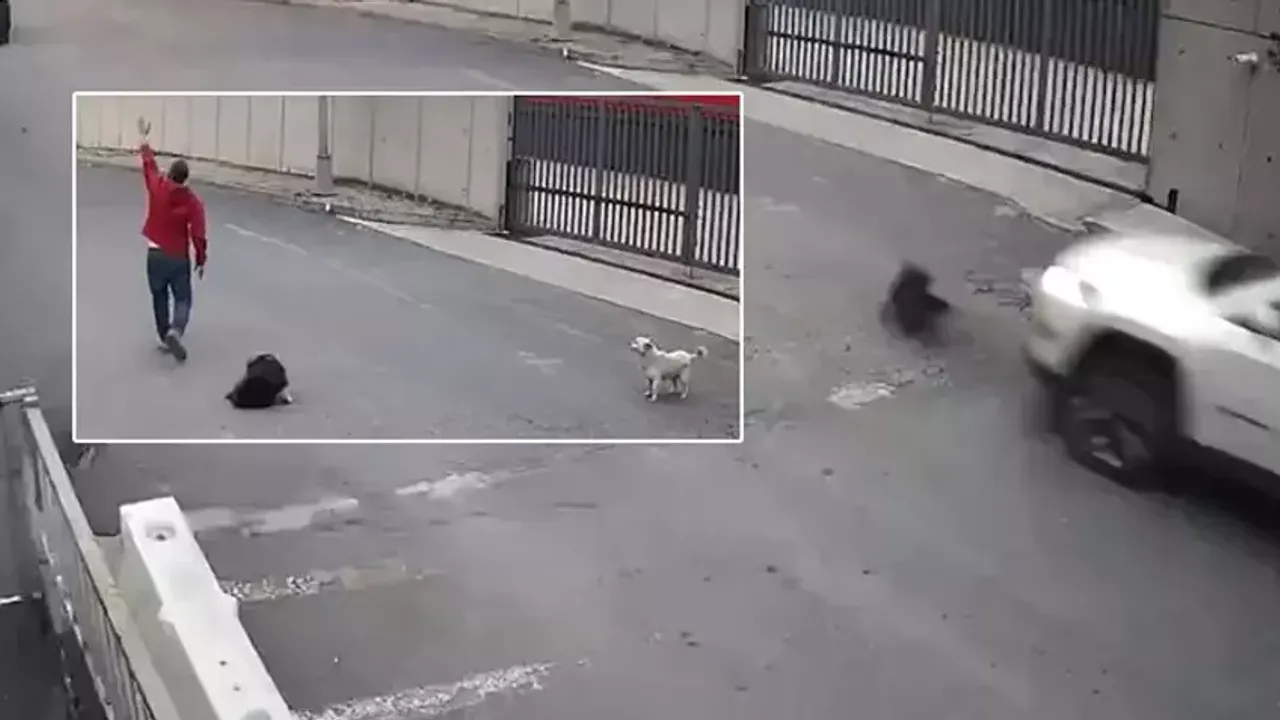 Görüntülerde, cipin köpeğin üzerinden geçtiği anlar görülüyor. Bu sırada köpeğin sahibiin yanında bulunan diğer köpek de yaralanan köpeğin yanuına geliyor. Can havliyel kendini yol kenarına atan köpeğin sahibi ise uzaklaşan cip sürücüsüne tepki gösteriyor.