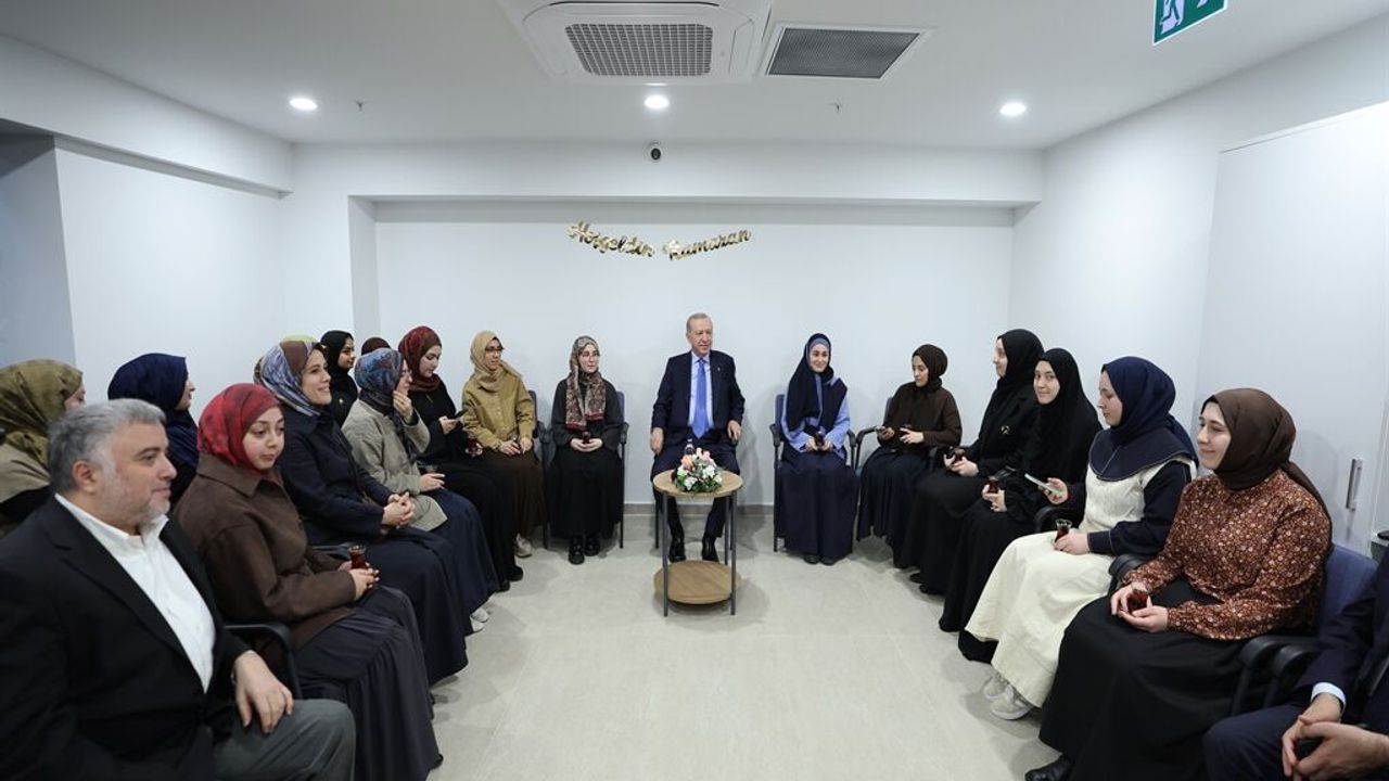 Cumhurbaşkanı Erdoğan dün gerçekleştirilen AK Parti İl Teşkilatı iftar programının ardından Marmara Üniversitesi İlahiyat Fakültesi Vakfı Ayşe Eren Yükseköğrenim Kız Öğrenci Yurdu’nu ziyaret etti. Erdoğan, öğrencilerle sohbet etti. Ziyaret, fotoğraf çekimi ile son buldu