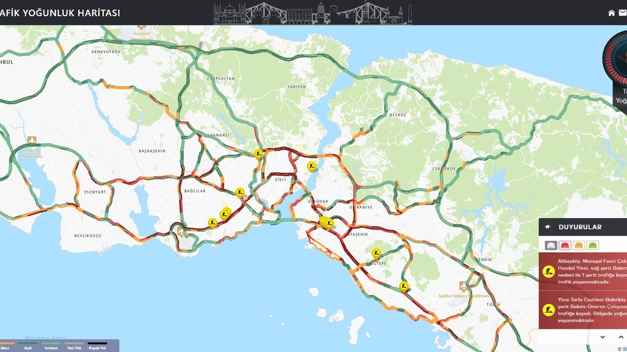 İstanbul'da akşam saatlerinde trafik yoğunluğu oluştu. İstanbul Büyükşehir Belediyesi Trafik Yoğunluğu Haritası verilerine göre haftanın son iş gününde saat 18.47 itibariyle yoğunluk yüzde 87'ye ulaştı. Kentteki ana arterlerde trafik durma noktasına geldi. D-100 Karayolu Bayrampaşa - Maltepe Mevkii'nde araçların güçlükle ilerlediği görüldü.