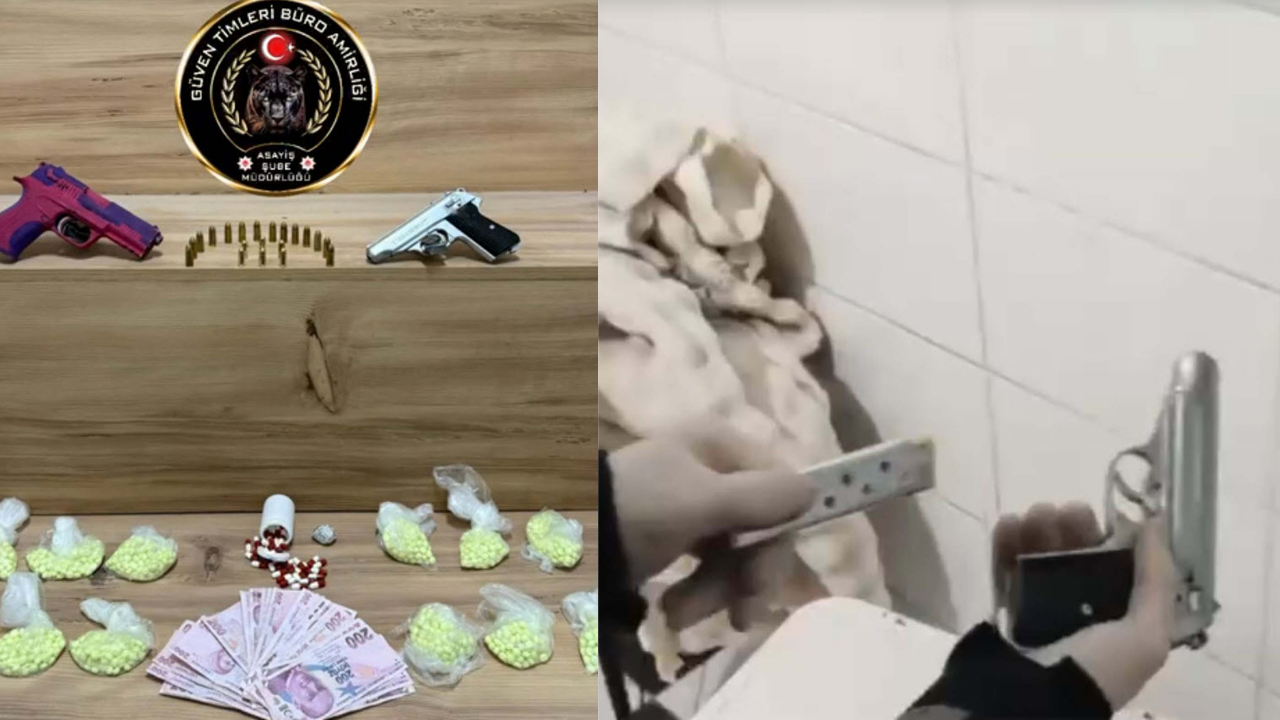 İzmir İl Emniyet Müdürlüğü Asayiş Şube Müdürlüğü ekipleri, silah kaçakçılığı ve yasaklı madde satışı suçlarına yönelik çalışma yaptı. Elde edilen bilgiler kapsamında dün Konak ilçesinde R.S.S. isimli şüphelinin adresine yapılan operasyonda, ruhsatsız 2 tabanca, şeffaf poşetler içerisinde 1163 adet ecstasy hap, 41 adet sentetik ecza, 1,36 gram esrar ve 5 bin 55 TL ele geçirildi. Gözaltına alınan şüpheli, Narkotik Suçlarla Mücadele Şube Müdürlüğü’ne teslim edildi. Polisteki işlemlerinin ardından adliyeye sevk edilen R.S.S., bugün çıkarıldığı mahkemece tutuklandı.