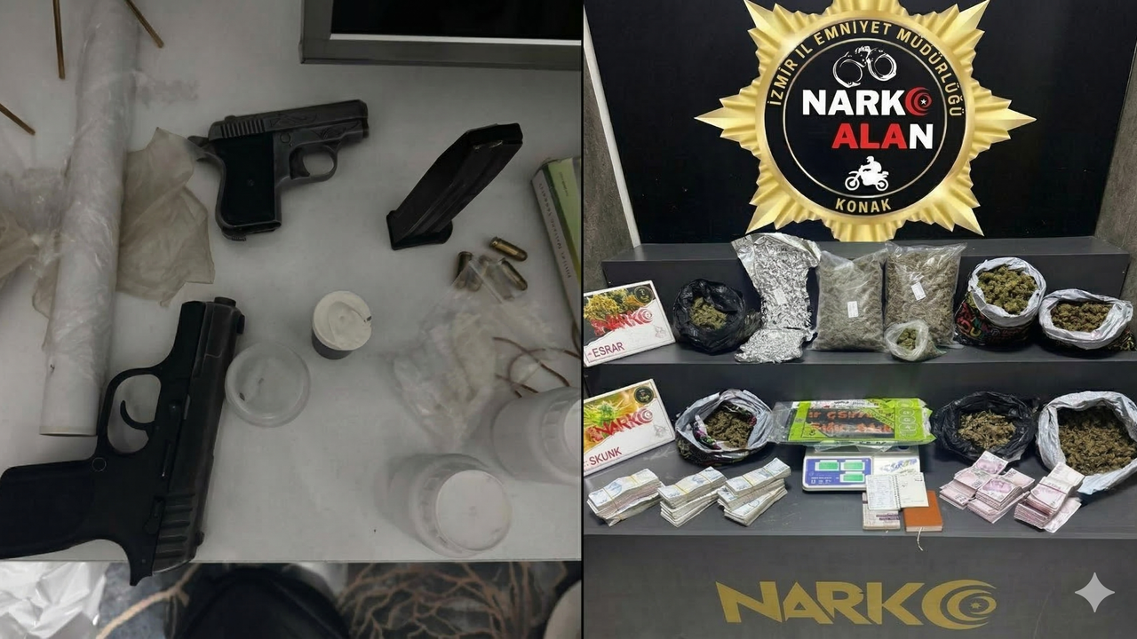 Konak İlçe Emniyet Müdürlüğü ile Narkotik Suçlarla Mücadele Şube Müdürlüğü personelinden oluşan Narko Alan ekipleri, ilçede yasaklı madde ticaretine yönelik yürütülen çalışmalar kapsamında belirlenen adreslere operasyon düzenledi. Adreslerde yapılan aramalarda 8 kilo skunk maddesi, 200 gram metamfetamin, 180 sentetik ecza, 3 hassas terazi, 2 ruhsatsız tabanca, 5 fişek ve 371 bin 500 lira nakit para ele geçirildi.