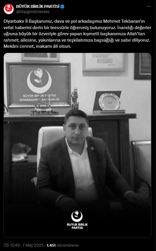 BBP Genel Merkezi tarafından 2019'da Diyarbakır İl Başkanlığı görevine getirilen Mehmet Tekbaran, dün evinde rahatsızlandı. Çağırılan sağlık ekiplerince özel bir hastaneye kaldırılan Tekbaran, kurtarılamadı. Tekbaran'ın kalp krizi geçirdiği belirtilirken, cenazesi otopsi işlemlerinin ardından Yeniköy Asri Mezarlığı’nda defnedildi. Tekbaran için Kayapınar ilçesi Medya Mahallesi'ndeki Hz. Ömer Taziye Evi'nde kuruldu.
