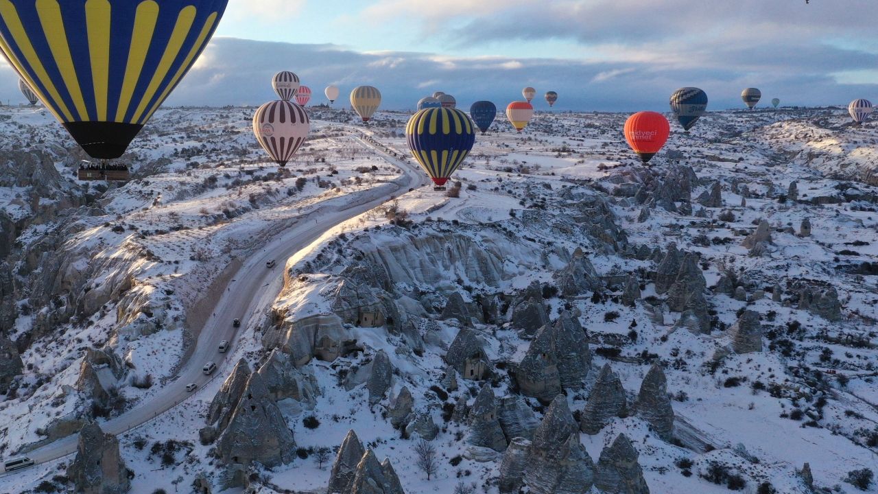 Kar yağışı sonrası beyaz örtüyle kaplanan peribacaları üzerinde süzülen balonlar, renkli görüntü oluşturdu.