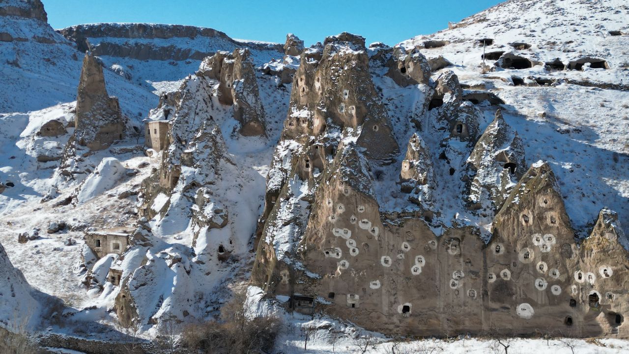 Kayseri’nin Yeşilhisar ilçesi Soğanlı Mahallesi’ndeki vadi, kar yağışı sonrası beyaza büründü. Kent merkezine 86, ilçe merkezine ise 15 kilometre uzaklıkta yer alan, kaya kiliseleri ve mağaraların bugünkü evler ile iç içe geçtiği bir vadi içerisinde bulunan bölge dronla görüntülendi.