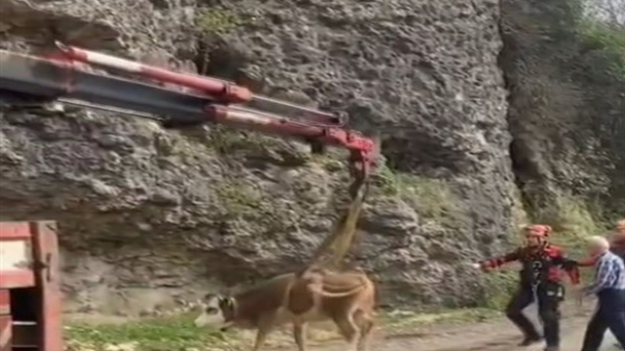 Karabük merkeze bağlı Başköy köyünde otlamaya çıkarılan inek metrelerce yükseklikten kayalık bölgeye düştü. Köylülerin ihbarı üzerine olay yerine ineği kurtarmak için AFAD ekipleri sevk edildi. Ekipler ineği kayalık çıkartamayınca bölgeye vinç gönderildi. Halatla vince bağlanan inek, düştüğü yerden kurtarıldı.