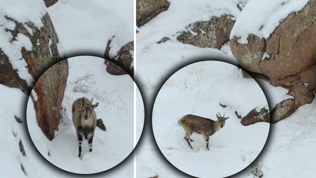 Özellikle sarp arazilerdeki tırmanma ve zor şartlarda yaşamlarını devam ettirme özellikleri ile bilinen dağ keçileri, yavruları ile kent merkezi yakınlarında görüntülendi. Kar birikintisi altındaki kayalıklar arasında dolaşan ve yiyecek arayan keçiler, amatör dron kamerasına takıldı. Bir süre gezinen keçi sürüsü, daha sonra kayalar arasından geçerek gözden kayboldu.