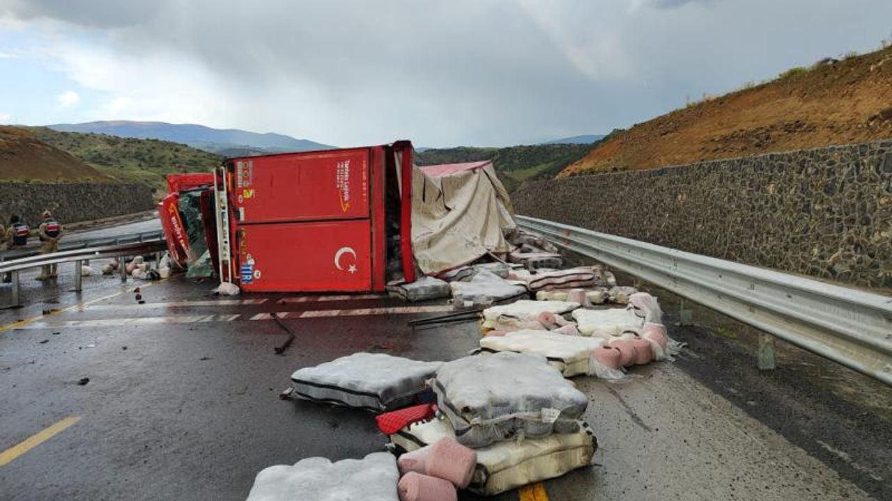 Mahmut Dip idaresindeki iplik yüklü tır, sürücüsünün direksiyon hakimiyetini kaybetmesi sonucu devrildi.