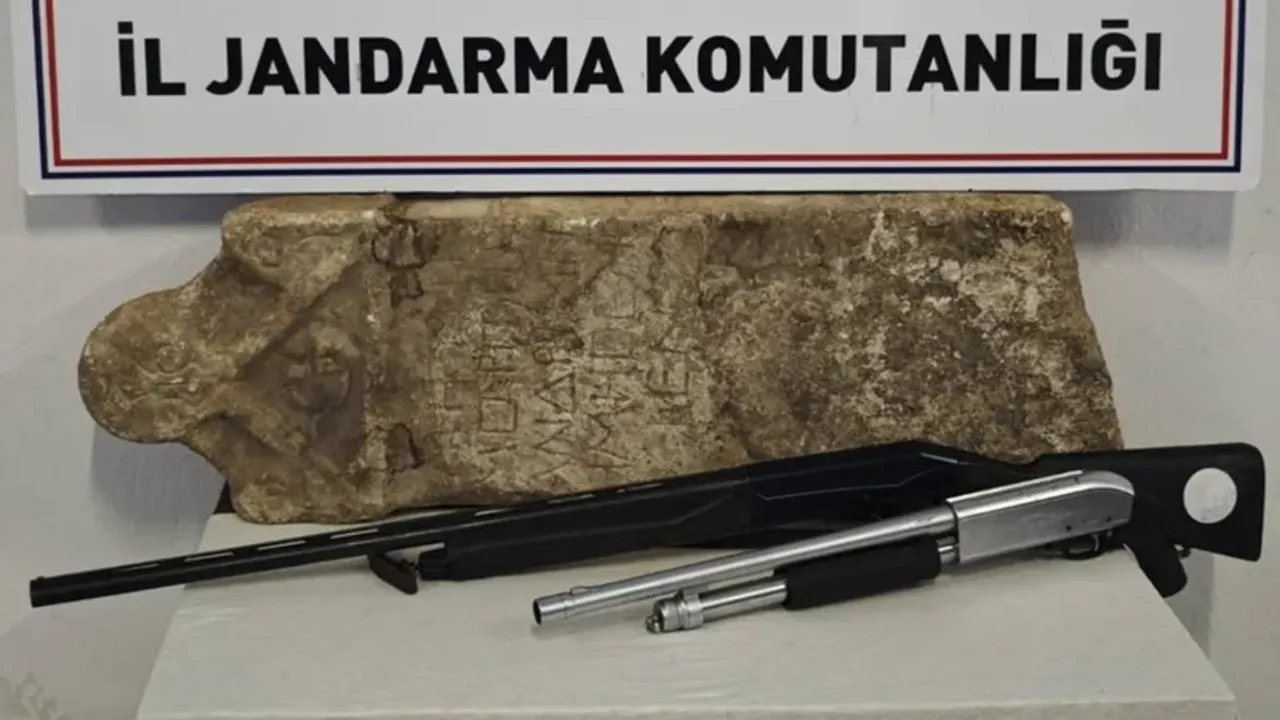 Zanlının evinde Roma dönemine ait mezar steli ile 2 ruhsatsız av tüfeği ele geçirildi.