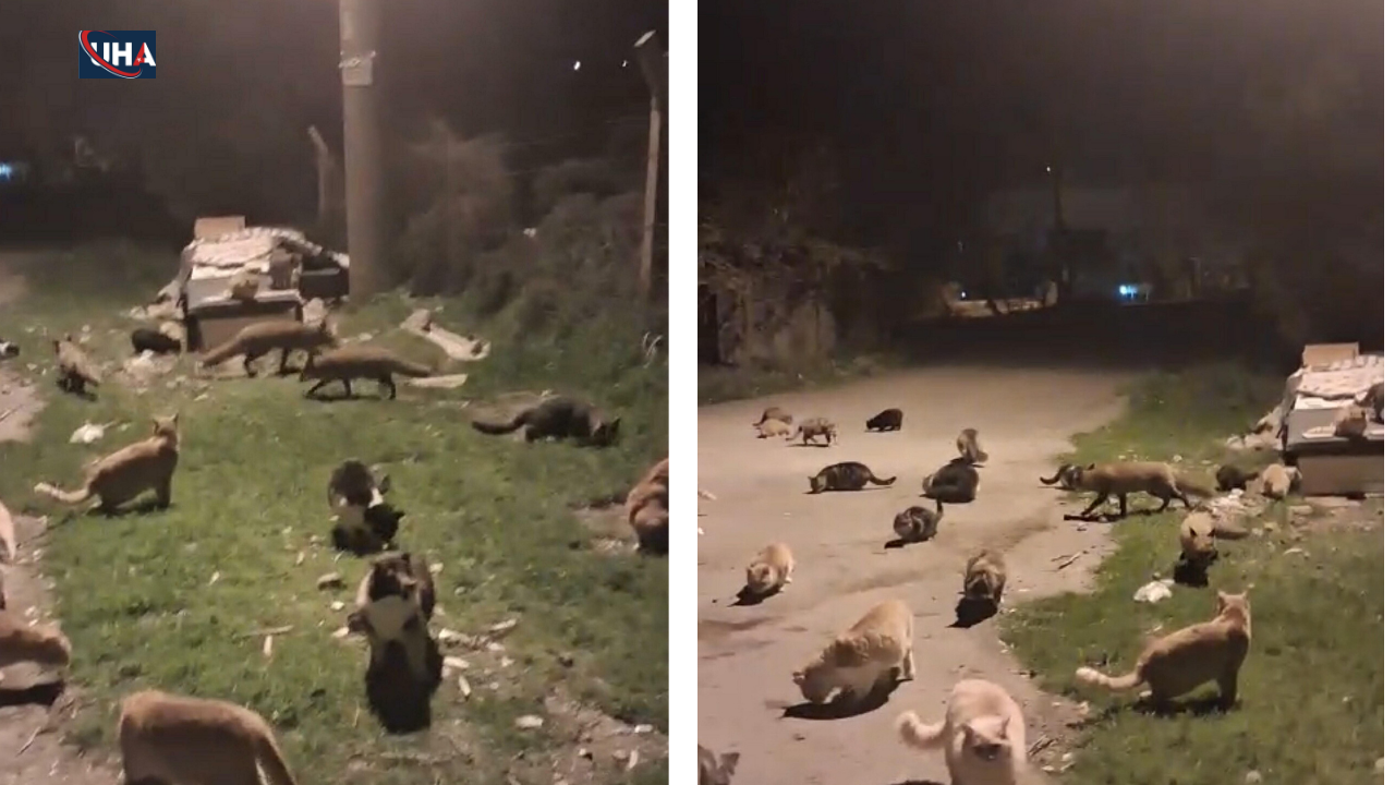 Küçükköy Mahallesi'nde bulunan bir sitede vatandaşların beslediği kedilere, son aylarda 5 tilki de katıldı. Kediler ile tilkilerin birlikte beslendiği anlar, vatandaşlar tarafından cep telefonlarıyla kaydedildi. Görüntülerde; hayvanların sakin bir şekilde birlikte beslendiği anlar yer aldı. (DHA)