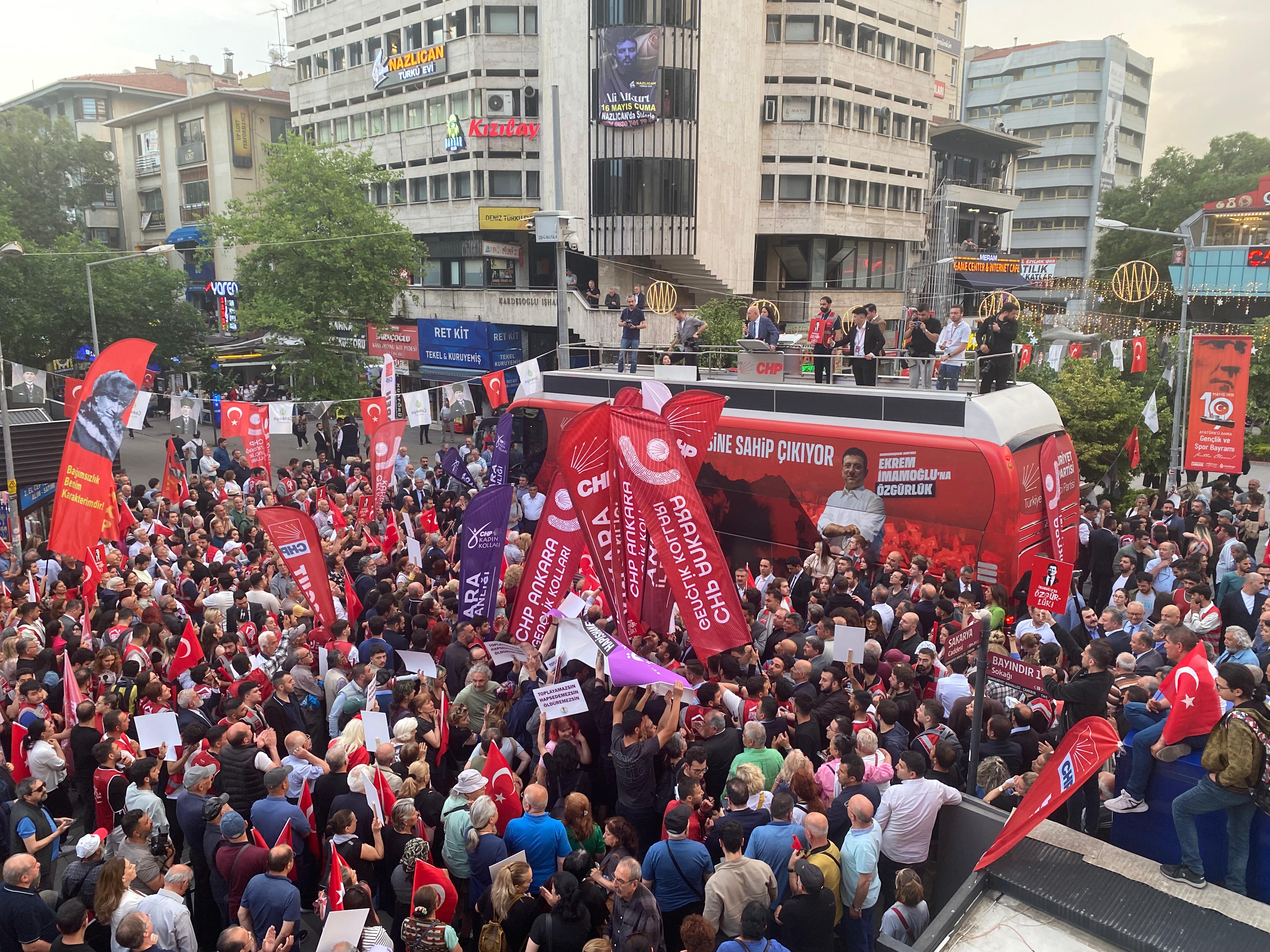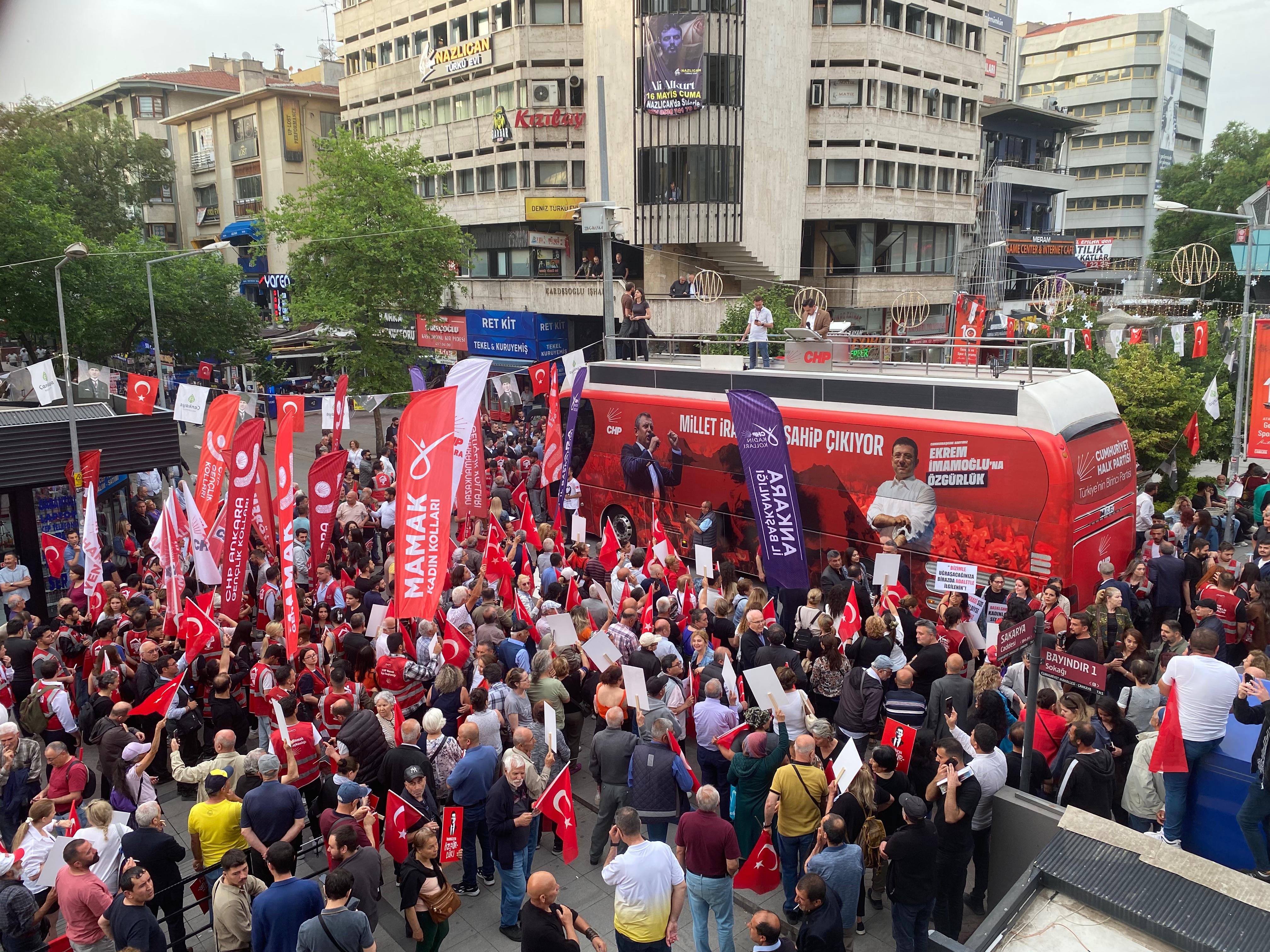 Ankara’da CHP Ankara İl Başkanlığı tarafından, 'Millet İradesine Sahip Çıkıyor' mitingi düzenlendi. Kızılay Sakarya Caddesi’nde düzenlenen mitinge CHP Genel Başkan Yardımcısı Gamze Taşcıer, CHP Grup Başkanvekili Murat Emir, ABB Başkanı Mansur Yavaş ve çok sayıda vatandaş katıldı. Program öncesinde bir dakikalık saygı duruşunda bulunuldu ve İstiklal Marşı okundu. Mitingde, Ekrem İmamoğlu'nun mesajı da okundu. İmamoğlu mesajında, "Benim inancımın ve cesaretimin, kararlılığımın en büyük kaynağı sizlerin inancı ve yüksek adalet duygusudur. Vicdanıdır. Türkiye'mizin şu geleceği için yola çıktık. Mutlaka başaracağız. Kötülük bitecek. İyilik, huzur ve başarıyı hep beraber getireceğiz. Bugün düzenlemiş olduğunuz adalet ve özgürlük buluşmasında inanın yanınızdayım. Sağınızda ve solunuzdaki kişi benim. Sizleri çok seviyorum. Ekrem İmamoğlu, Marmara Cezaevi" ifadelerine yer verdi.