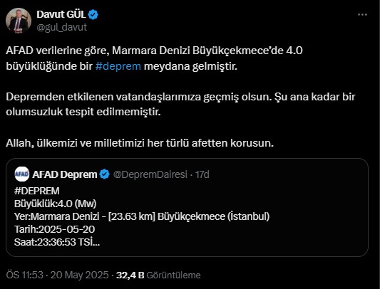 İstanbul Valisi Davut Gül, sosyal medya hesabından açıklama yaptı. Vali Gül açıklamasında, "AFAD verilerine göre, Marmara Denizi Büyükçekmece’de 4.0 büyüklüğünde bir #deprem meydana gelmiştir. Depremden etkilenen vatandaşlarımıza geçmiş olsun. Şu ana kadar bir olumsuzluk tespit edilmemiştir. Allah, ülkemizi ve milletimizi her türlü afetten korusun" ifadelerini kullandı.