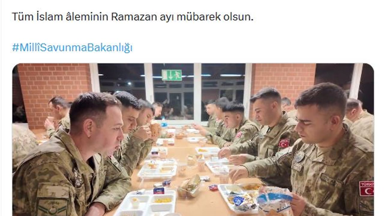 Bakanlığın sanal medya hesabından paylaşılan görüntülerle birlikte, "Yurdun dört bir yanında ve dünyanın birçok bölgesinde görev yapan Kahraman Mehmetçiklerimiz ilk sahurlarını yaptı. Tüm İslam aleminin ramazan ayı mübarek olsun" denildi.