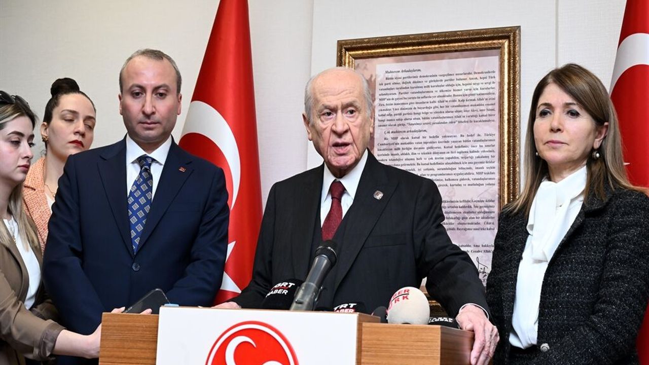 Bahçeli, basın mensuplarının ABD-İsrail ve İran arasında süren savaşın seyrine ilişkin sorusu üzerine, "Türkiye Cumhuriyeti Devleti bölgedeki gelişmeleri çok yakından takip ediyor. Bugüne kadar uygulamış olduğu değerlendirmeler ışığında çevre ülkeler de dahil olmak üzere dünya genelinde ülkeler arası çatışmaya fırsat vermeyecek bir barış ve huzur ortamının gerçekleşmesi için çaba sarf ediliyor. Sayın Cumhurbaşkanımız ve Dışişleri Bakanımız başta olmak üzere bugünkü siyasi iktidar üstün bir gayret göstermek suretiyle barışın sağlanması, silahların susması ve huzura kavuşulması açısından önemli temaslarda bulunuyorlar. Şu ana kadar yaptıkları değerlendirmeler ışığında çevrede önemli şiddet olayları, büyük çatışmalar olmakla beraber Türkiye'yi birlik ve beraberlik içerisinde savaşın dışında tutan bir anlayışla muhafaza etmişlerdir. MHP olarak Cumhur İttifakı kapsamı içerisinde bugünkü değerli yönetime, Sayın Cumhurbaşkanımız ve Dışişleri Bakanımıza başarılar diliyorum. Temennimiz ise en kısa zamanda silahların susmasıdır. Bu silahları sustururken 'Süper güç' olarak kendilerini niteleyen; fakat iradeleri dışında her ülkenin milli iradesiyle çelişecek tarzda rejim değişikliklerine heves eden insanları; insanlığa, demokrasiye ve ülkelerin varlığına saygı duymaya davet ediyorum. Onun için her şeyden evvel bir rejim değişikliği olacaksa eğer bu değişiklik İsrail'den başlamalıdır. İsrail'in karanlık emelleri son bulmalı, bölgenin ve dünyanın tekrardan huzura kavuşması için gayret göstermelerini istiyoruz. Bunun da en büyük sorumlusu, bugünkü şartlar içerisinde ABD'ye düşmektedir. ABD'nin bugünkü yönetimi çok konuşuyor, tartışıyor, farklı şeyler söylüyor. Onların bu farklı söylemlerini Türk medyası da sanki her gün 'yarın bir şeyler olacakmış' gibi topluma takdime gayret gösteriyor. Bu da toplumun barışa olan güvenini sarsacak bir hataya düşmesine sebebiyet veriyor. Onun için siz değerli medya mensubu arkadaşlarımız başta olmak üzere medyanın yöneticilerine gerçekler üzerinde tartışma yaparak en iyi şekilde görev üstlenmeleri, yoksa bir devletin başkanının her gün ne yaptığını tekraren ifade edecek tarzda bir hataya düşmemelerini de temenni ediyorum" diye konuştu.