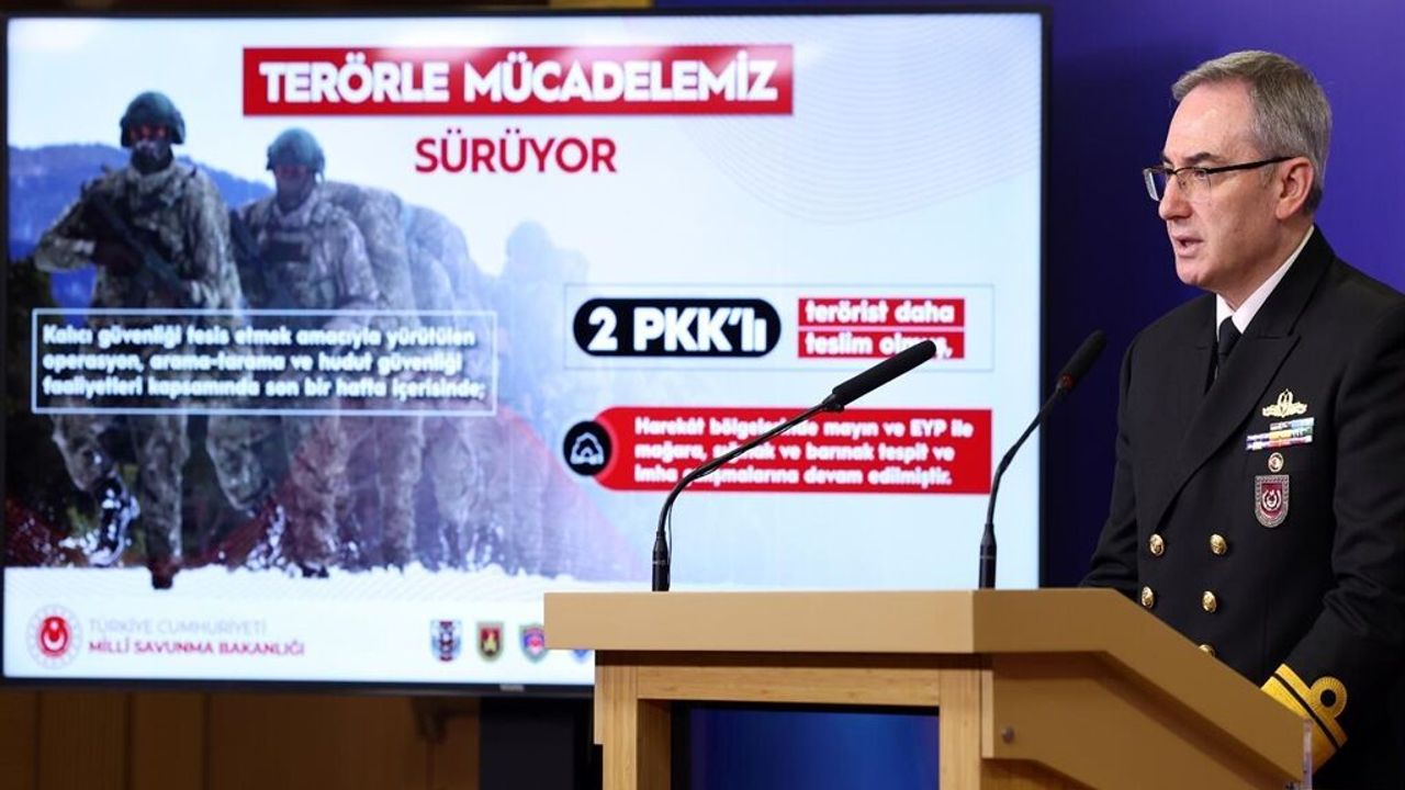 Tuğamiral Aktürk, kalıcı güvenliği tesis etmek amacıyla yürütülen operasyon, arama tarama ve hudut güvenliği faaliyetleri kapsamında son bir hafta içerisinde 2 PKK’lı teröristin daha teslim olduğunu, harekat bölgelerinde mayın ve el yapımı patlayıcı ile mağara, sığınak ve barınak tespit ve imha çalışmalarına devam edildiğini kaydetti.