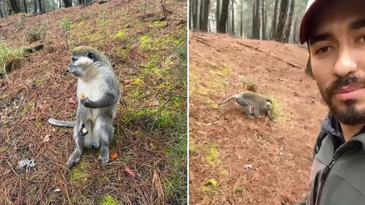Nizamettin Yiğit, önceki gün, Pamukkale ilçesi Kınıklı Mahallesi'ndeki Çamlık mesire alanına mantar toplamaya gitti. Yiğit, ormanda gezerken önüne başıboş dolaşan bir maymun çıktı. Yiğit, Doğa Koruma ve Milli Parklar Müdürlüğü'nü (DKMP) telefonla arayarak maymun gördüğünü bildirdi. Ekipler ormana gelene kadar maymunu oyalamak için simitle beslediğini belirten Yiğit, o anları da cep telefonuyla kaydetti. Ormana gelen DKMP ekipleri, 'örümcek' cinsi olan maymunu yakalamak istedi. Ancak, maymun uzaklaşıp kayboldu. Ekipler, biri tarafından ormana bırakıldığı düşünülen maymunun bulunup, koruma altına alınması için çalışma başlattı.