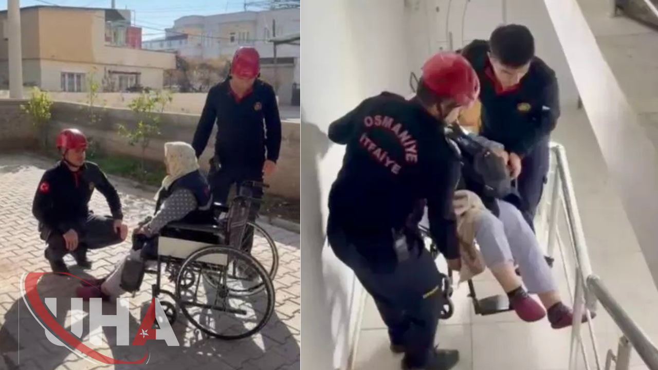 Tekerlekli sandalyede bulunan yaşlı kadın, iki itfaiye eri eşliğinde merdivenlerden taşınarak ikinci kattaki evine güvenli bir şekilde çıkarıldı. O anlarda bir kadın komşunun el feneriyle ekiplere ışık tutarak yardımcı olduğu görüldü.
