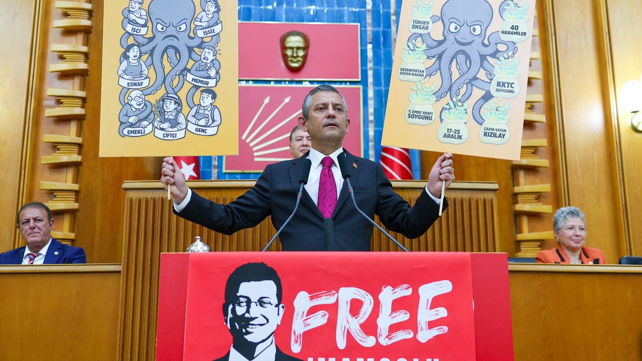 Özel, kürsüden ahtapot görselleri bulunan dövizleri göstererek, "Tayyip Bey kendi kendine bir ahtapot görüyor. Sürekli ahtapot anlatıyor. Ahtapotun kollarını arıyorsan, işte Fatih Belediyesi, işte Bayrampaşa Belediyesi, öbür kolunda Bahçelievler Belediyesi, pek yakında büyük kol Esenler Belediyesi, kafadan çıkıyor en büyük kol. Ama ben Tayyip Bey'in esas ahtapotunu göstereyim. Bu Tayyip Bey'in ahtapotunda, '5'li çete' dediğin kırk haramiler, yaklaşık 43 şirket bunlar. Kuzey Kıbrıs Türk Cumhuriyeti (KKTC) soygunu; Özel Kalem Müdürü Serim'in gencecik oğlunu önce Dışişleri'nde özel kalem yapıp, Kıbrıs'a büyükelçi yapıp, hem kaset toplatıp hem oradaki büyük vurgunlar, gemiler, gemilerde yakalananlar. Çadır satan Kızılay'ın vurgunu. 17-25 Aralık. Yunus Emre Vakfı soygunu, ahtapotun milliyetçi kolu. Dezenfektan satan bakan da ahtapotun bir kolunda. TÜRGEV'i, Ensar'ı; kol yetmedi, ayrı ayrı yazamadık, ikisi birden ahtapotun bir kolunda. İşte ahtapotun besledikleri. Bu da ahtapotun canından bezdirdikleri, boğazını sıktıkları. Bir elinde işçi, bir elinde esnaf, bir elinde emekçi, bir elinde çiftçi. Gençlerin geleceğini tüketti ahtapotun ta kendisi. Memuru, işsizi, bitirdiniz memleketi. Ahtapot meraklılarına gösterilir. Reis'in tarif ettiği ahtapot, Özgür Özel'in ellerinde" diye konuştu.