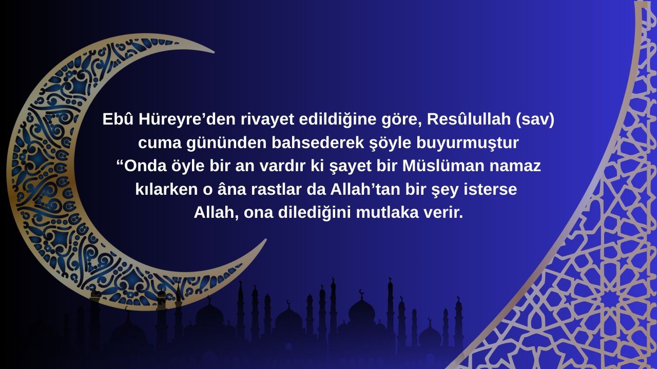 On bir ayın sultanı Ramazan’da tutulan oruçlar ve kılınan namazlar, Cuma gününün kutsiyetiyle taçlanıyor. Ebû Hüreyre’den rivayet edilen hadis-i şerife göre; Cuma günü içerisinde öyle bir an vardır ki, o ana ibadetle rastlayan bir Müslümanın duaları geri çevrilmez.