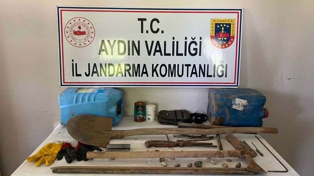 Karacasu Jandarma Komutanlığı ekipleri, kırsal Gayre Mahallesi yakınlarında 1'inci derece SİT alanı olan bölgede kaçak kazı yapıldığı bilgisine ulaştı. Bu kapsamda, ekipler bölgeye dün akşam saatlerinde operasyon düzenledi. Kaçak kazı yapılan alandaki aramalarda; 1 çapa, 1 kürek, 1'er metre uzunluğunda 4 demir çubuk, 1 bidon, 1'i titanyum diğeri pirinç alaşımlı toplam 2 alan tarama çubuğu ve 2 bronz yüzük ele geçirildi. Kaçak kazı yaptıkları belirlenen İ.Ç., B.S., C.A., S.A. ve A.O. gözaltına alındı. Şüphelilerin jandarmadaki işlemlerinin sürdüğü bildirildi.