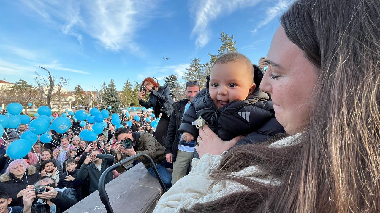 Tedavi için Dubai’ye gidecek olan Rüzgar bebek için kent meydanında yüzlerce mavi balon gökyüzüne bırakılırken, anne Ebru Göktaş gözyaşlarına boğuldu.