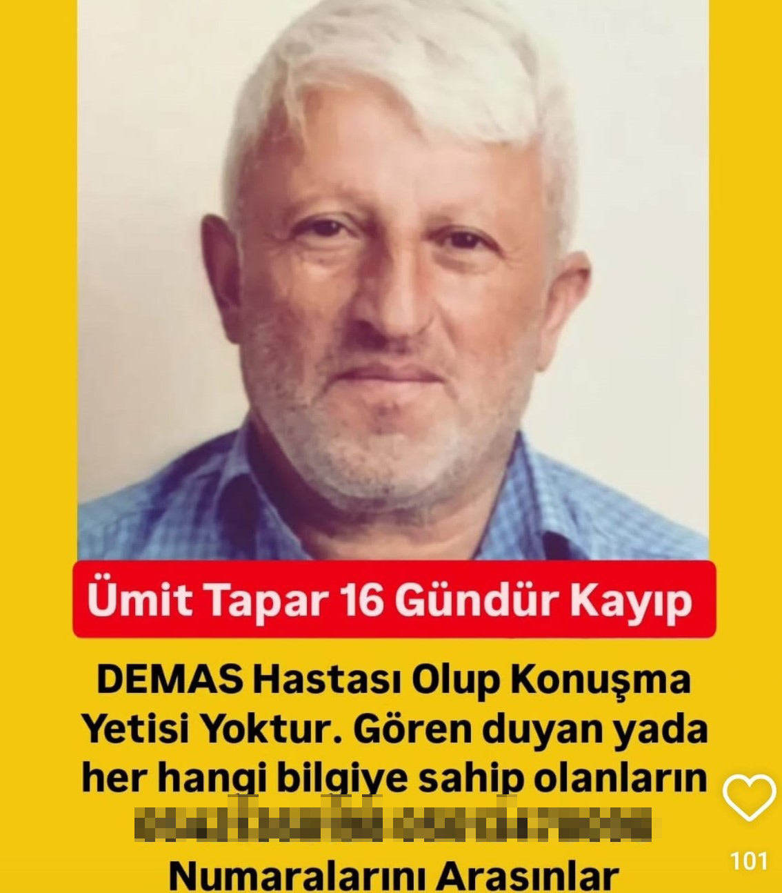 Olay, dün öğle saatlerinde 50. Yıl Mahallesi'nde bulunan askeri bölgede yaşandı. İhbar üzerine olay yerine giden ekipler boş alanda erkek cesediyle karşılaştı. Olay yerinden yapılan çalışmaların ardından ceset Adli Tıp Kurumu morguna kaldırıldı. Burada yapılan incelemelerde ise cesedin yaklaşık 16 gündür kayıp olan demans hastası Ümit Tapar’a ait olduğu belirlendi. Adli Tıp Kurumu'ndaki işlemlerin ardından Tapar'ın cenazesinin ailesine teslim edileceği öğrenildi.