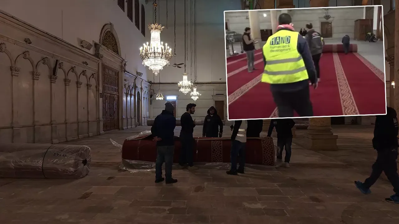 Suriye'nin başkenti Şam'daki Emevi Camii'nde Esad rejiminin ardından yenileme çalışmaları sürüyor. Ramazan ayına günler kala gerçekleştirilen hazırlıklar çerçevesinde tarihi camiye Cumhurbaşkanı Recep Tayyip Erdoğan'ın seçtiği ve Gaziantep'ten gönderilen bordo renkli yün halılar serilmeye başlandı.