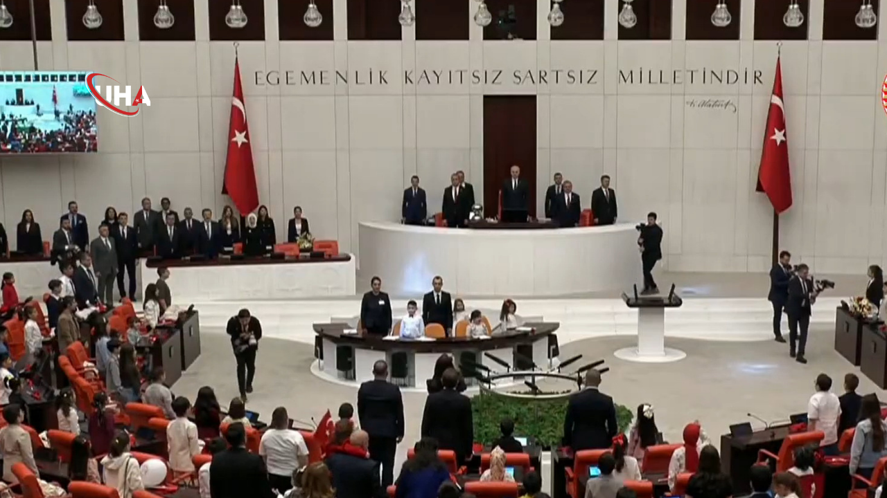 TBMM Genel Kurulu, çocuk özel gündemiyle Meclis Başkanı Numan Kurtulmuş başkanlığında toplandı. Oturuma, Milli Eğitim Bakanı Yusuf Tekin, Yeni Yol Partisi Grup Başkanvekili Mehmet Emin Ekmen, milletvekilleri ve çok sayıda çocuk katıldı. TBMM Başkanı Numan Kurtulmuş, oturumu açtı ve Genel Kurul'da İstiklal Marşı okundu. Ardından konuşan Kurtulmuş, "TBMM, dünyadaki diğer meclislerden farklı olarak devlet kurulduktan sonra oluşturulmuş bir yapı değildir. Milletvekilleri, Ulus'ta bulunan 1'inci Meclis'te henüz Milli Kurtuluş Mücadelemiz verilirken bir araya gelmiştir. Bunlardan bir kısmı İstanbul'daki İngiliz işgali dolayısıyla dağıtılmış olan Meclis-i Mebusan'ın üyelerinden bir kısmı ise Anadolu'nun dört bir tarafından seçilmiştir. Bu milletvekilleri vasıtasıyla milletimiz henüz devleti kurmadan önce Meclis'i kurmuştur. Böylelikle 1'inci Meclis sadece yasaların çıkarılması ya da sadece birtakım denetim faaliyetlerinin ötesinde, Türkiye'nin verdiği 'Ulusal Kurtuluş Mücadelesi'nin bir karargahı, ordu merkezi, emir-komuta merkezi olarak çalışmıştır. O zor günlerde Milli Kurtuluş Mücadelemizi veren ve 1'inci Meclis'imizin de Başkanı olan Gazi Mustafa Kemal Atatürk ve arkadaşları olmak üzere o Meclis'in bütün kahramanlarını saygıyla ve minnetle hatırlıyoruz" ifadelerini kullandı.