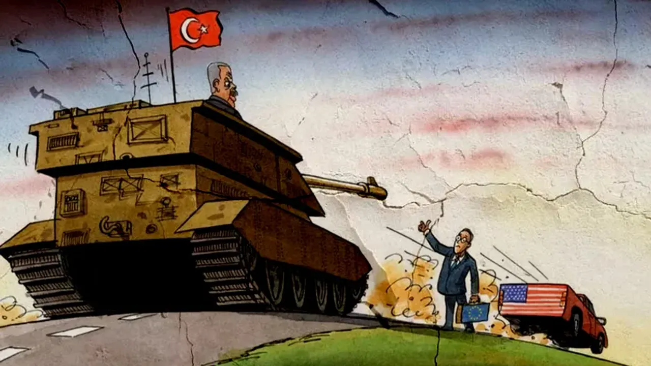 Dergini kullandığı görselde tank üzerindeki Cumhurbaşkanı Recep Tayyip Erdoğan’ı resmetmesi dikkat çekti.