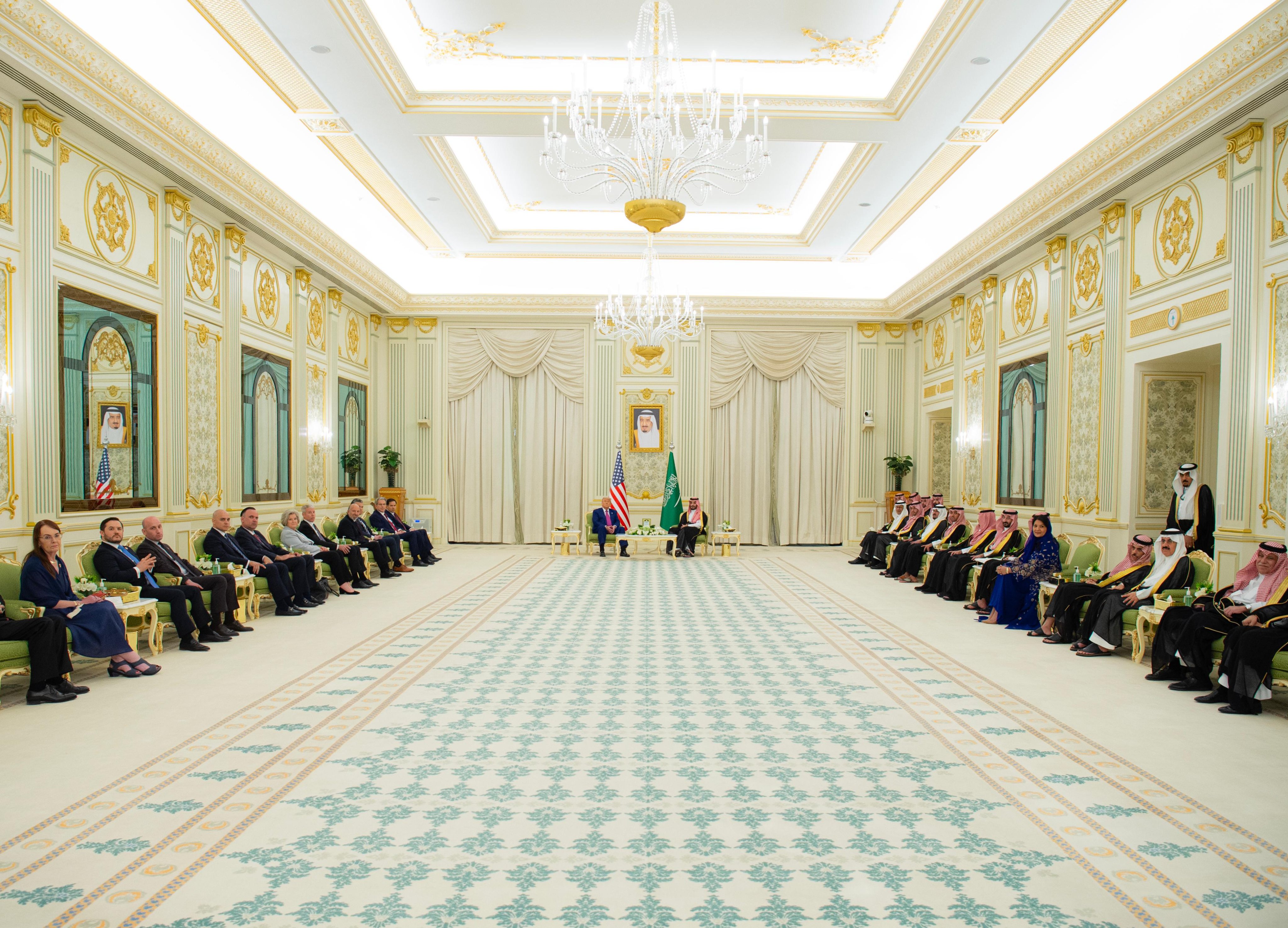 ABD Başkanı Donald Trump, Suudi Arabistan'ın başkenti Riyad'daki Kral Halid Havalimanı'ndaki karşılama töreninin ardından Al Yamamah Sarayı'na geçti. Trump, sarayda Suudi Arabistan Veliaht Prensi Muhammed bin Selman tarafından resmi törenle karşılandı. ABD Başkanı Trump ve Prens Selman, Suudi Arabistanlı-ABD'li yetkililer, üst düzey askeri isimler ve iş dünyasının önde gelen isimleriyle yaklaşık bir saat görüştü. Görüşmede; Tesla ve SpaceX'in CEO'su Elon Musk, yapay zeka şirketi OpenAI CEO'su Sam Altman, Nvidia'nın CEO'su Jensen Huang, FIFA Başkanı Gianni Infantino gibi isimler yer aldı.